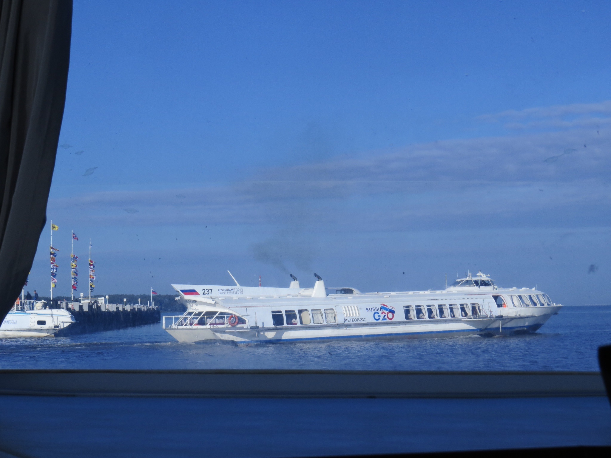 Took off early today to catch the hydrofoil to Peterhof, the summer palace of the Tsars. The hydrofoil took us out onto the broad Neva River for about a half hour trip. We arrived just in time to hear patriotic Russian music and witness the ceremonial setting of the fountains for the day. A long canal feeds the fountains which are powered by gravity. Talk about curb appeal!