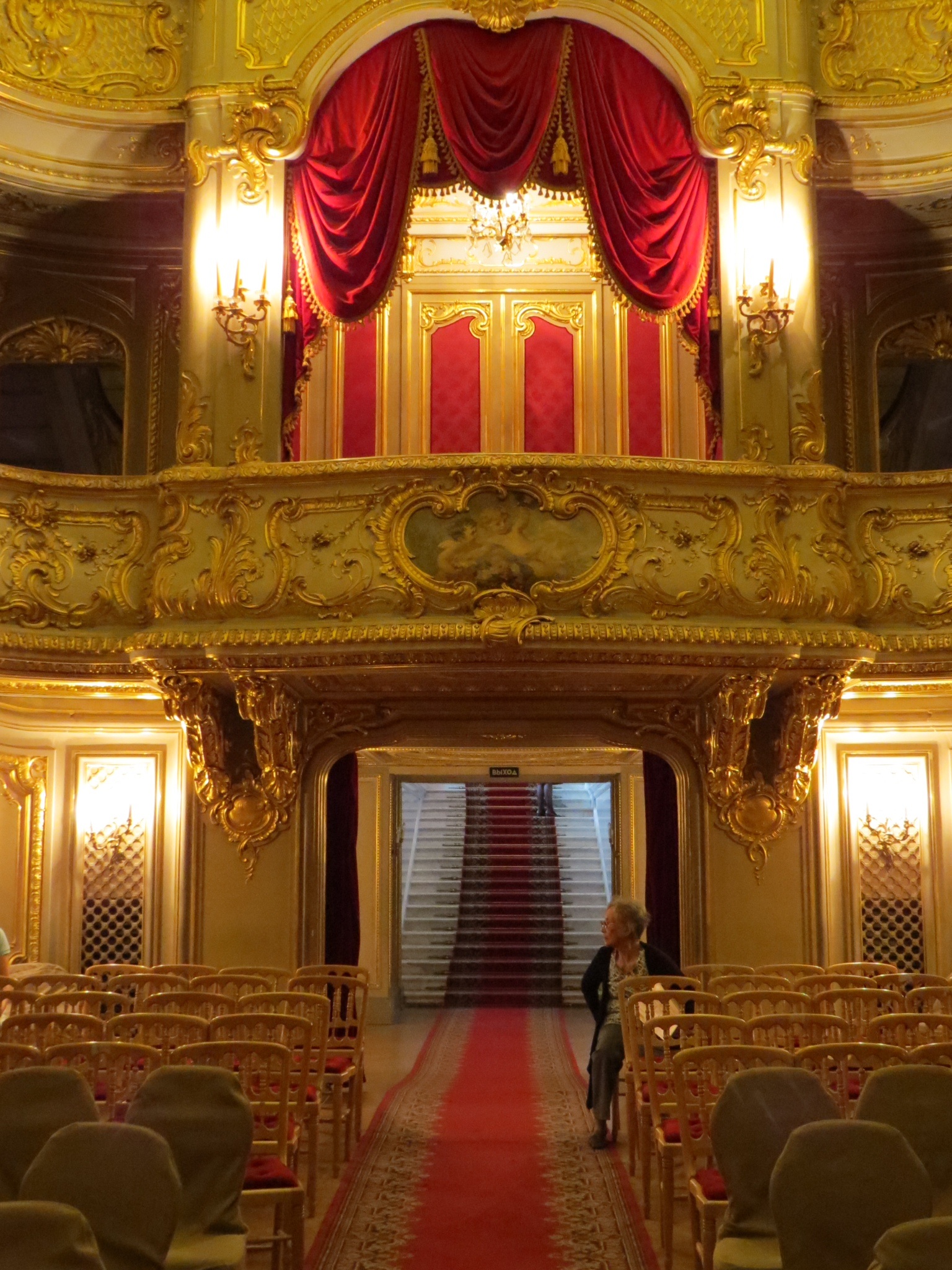 Each palace has its special something, and in the Yusopov palace it was a small, elegant private theatre with seating for 180 guests. Filled with gold ornamentation and red velvet, it was beautiful and we lingered here. Before our trip we had watched a PBS Great Performances special (which is available on the pbs website) in which Renee Fleming performed opera favourites in several St. Petersburg palace theatres, and the Yusopov was one of these theatres. It was easy to imagine sitting here in a silk gown listening to a rich Tchaichovsky opera sung by a Russian mezzosoprano while sipping champagne and nibbling on caviar. Ahhhhh……