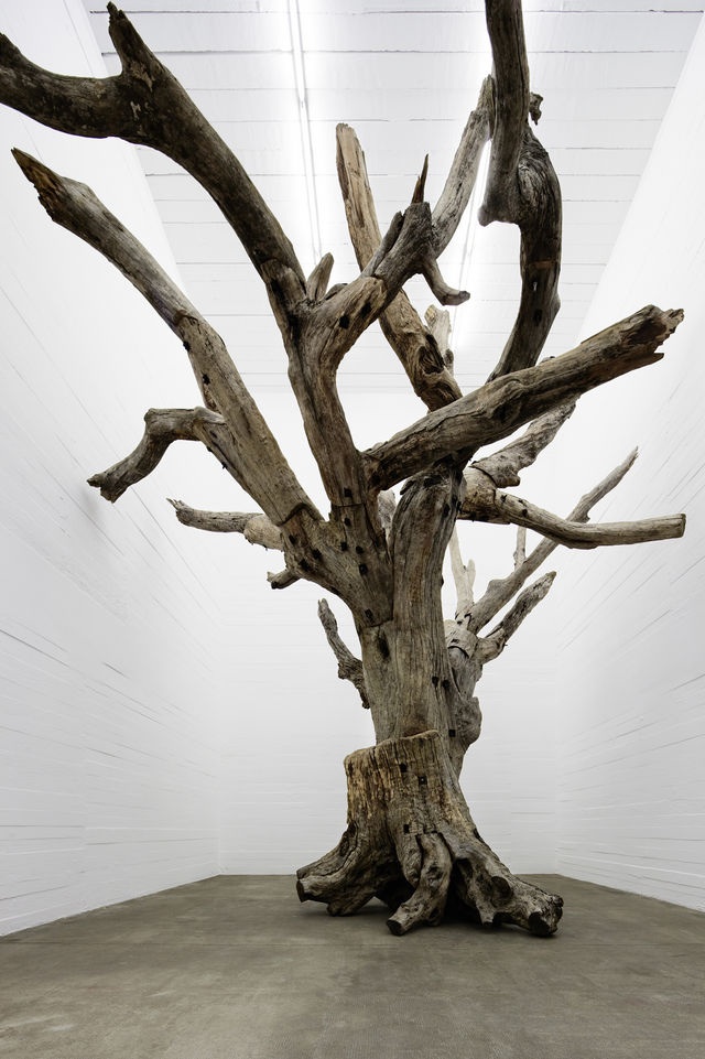 These are mostly large installations which the artists were able to install themselves. We were encouraged, and the tour led us, to explore and walk through all the pieces. They teased your sight, sound, touch and even smell, which the art historian-docent called “synthesization.” There was everything from a popcorn machine pumping out popcorn – which is beginning to fill a room having been installed over a year ago – to a series of pipes cutting across rooms from wall to wall; to engaging photography, to – and best of all – an Ai Wei Wei installation! I was so surprised and excited to actually see Ai Wei Wei’s work. I had seen a documentary at the film festival about him; he is a world-famous Chinese artist who is an activist within China, and he has been under house arrest for about the past two years. He designed the gorgeous “bird’s nest” stadium for the Beijing Olympics, and was given all sorts of rewards, beautiful studio etc. while world attention was on them, but afterward they bull-dozed the new studio and arrested him. Before that he travelled extensively with his work which has been displayed at MOMA, the Tate Modern and in Berlin. This work is titled Tree, one of a series he did using pieces of dried wood from various types of trees, which are sold by locals in one area of China. The new tree is fastened together with bolts and washers. The use of natural and manmade materials represents heaven and earth. It filled a room, and visually the contrast between the driftwood-coloured tree against the white walls made the space as interesting as the piece itself. The majority of the works, including Tree, dealt with the passing of time and life’s transitory nature.
