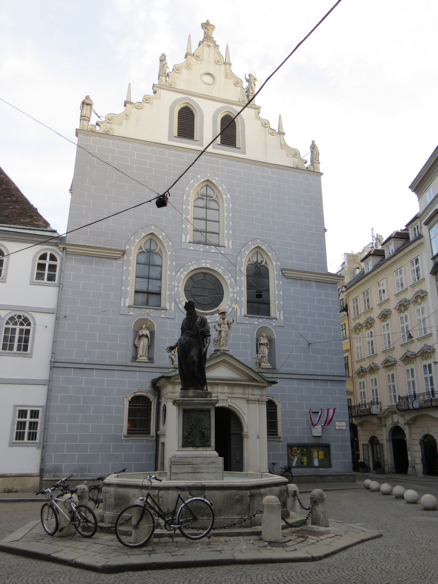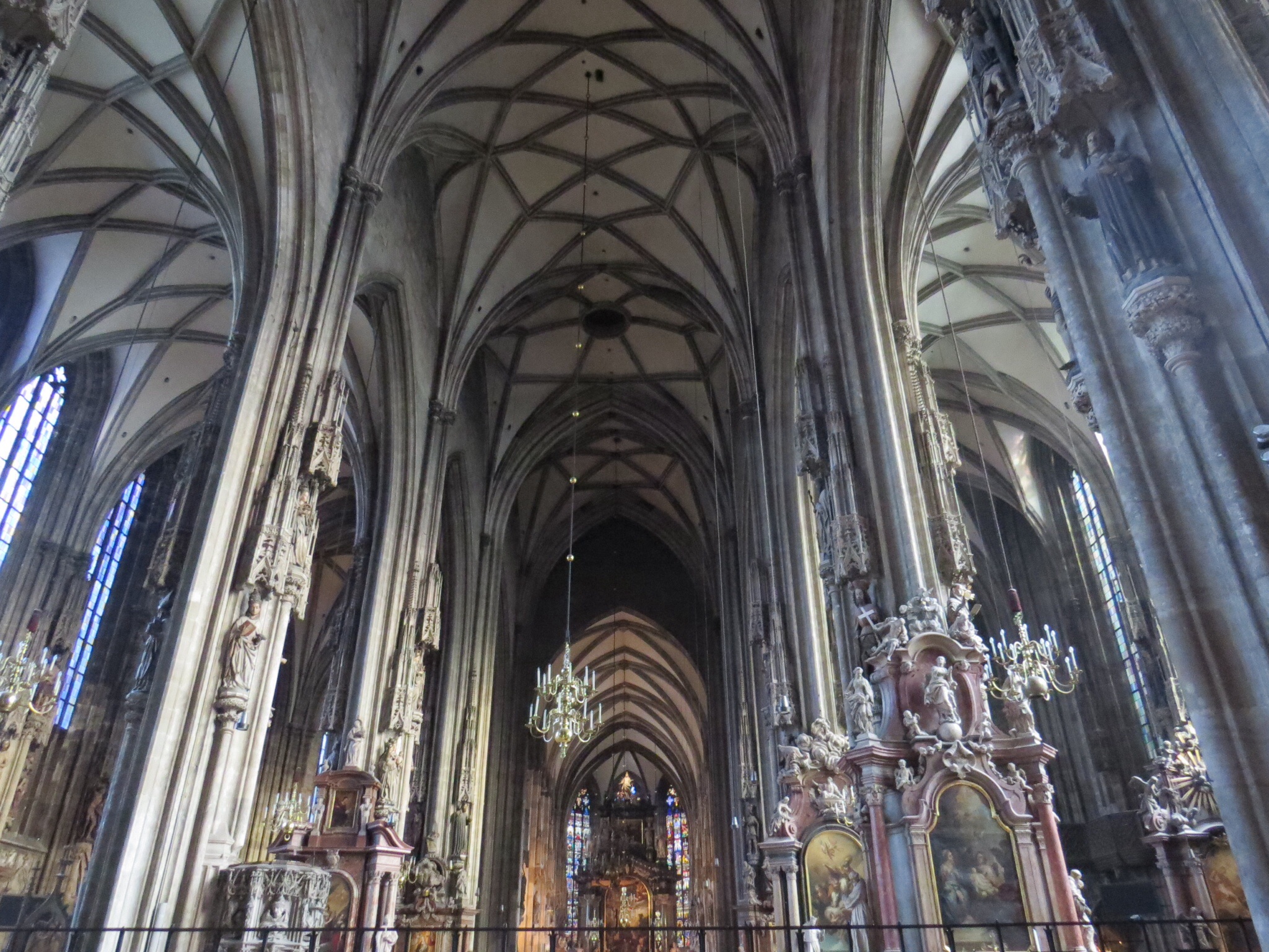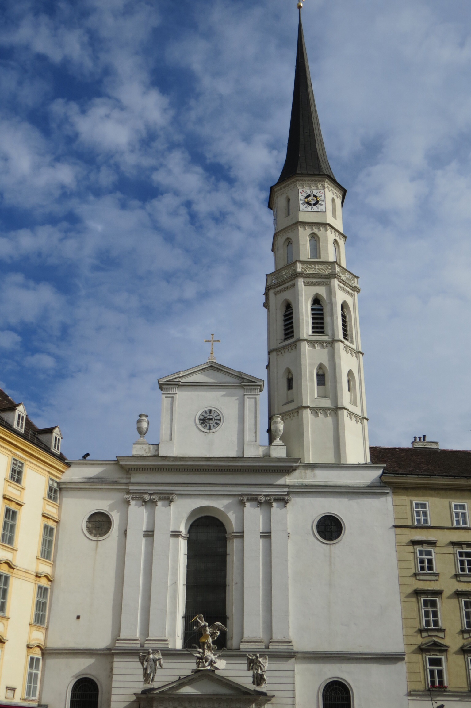 The first church I visited was Michaelerkirche, next door to the Hofburg Palace, the imperial “Winter Palace.” St. Michael’s Church, built in around 1220 AD, was built in the Romanesque style. Appropriately, just outside its door a Roman ruin was discovered and is being lovingly restored. Mozart’s Requiem was first played here; imagine hearing it here. (Mozart’s home where he wrote this on his deathbed is just a 10-minute walk down the street. Although Mozart wrote this for an anonymous patron, he would have known he himself was dying, he would have realized this was his last. His faithful student, to critical praise now, finished the Requiem after he died.) The Church is known for its catacombs which house some 4,000 former wealthy Vienna residents. Some have mummified and are displayed with open coffins. I couldn’t partake because of the service, and I’m not sure I would have had the stomach for it in any event.