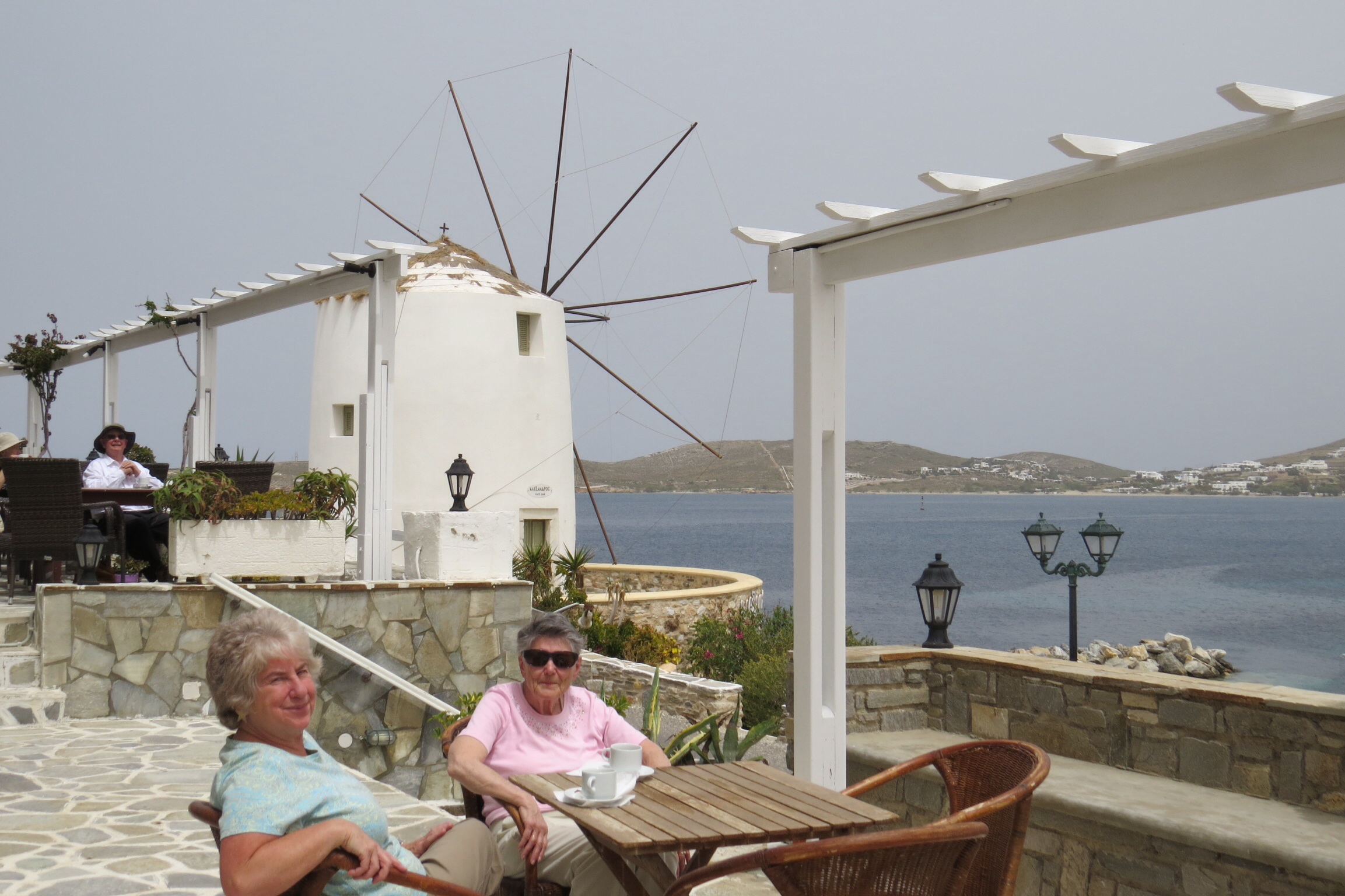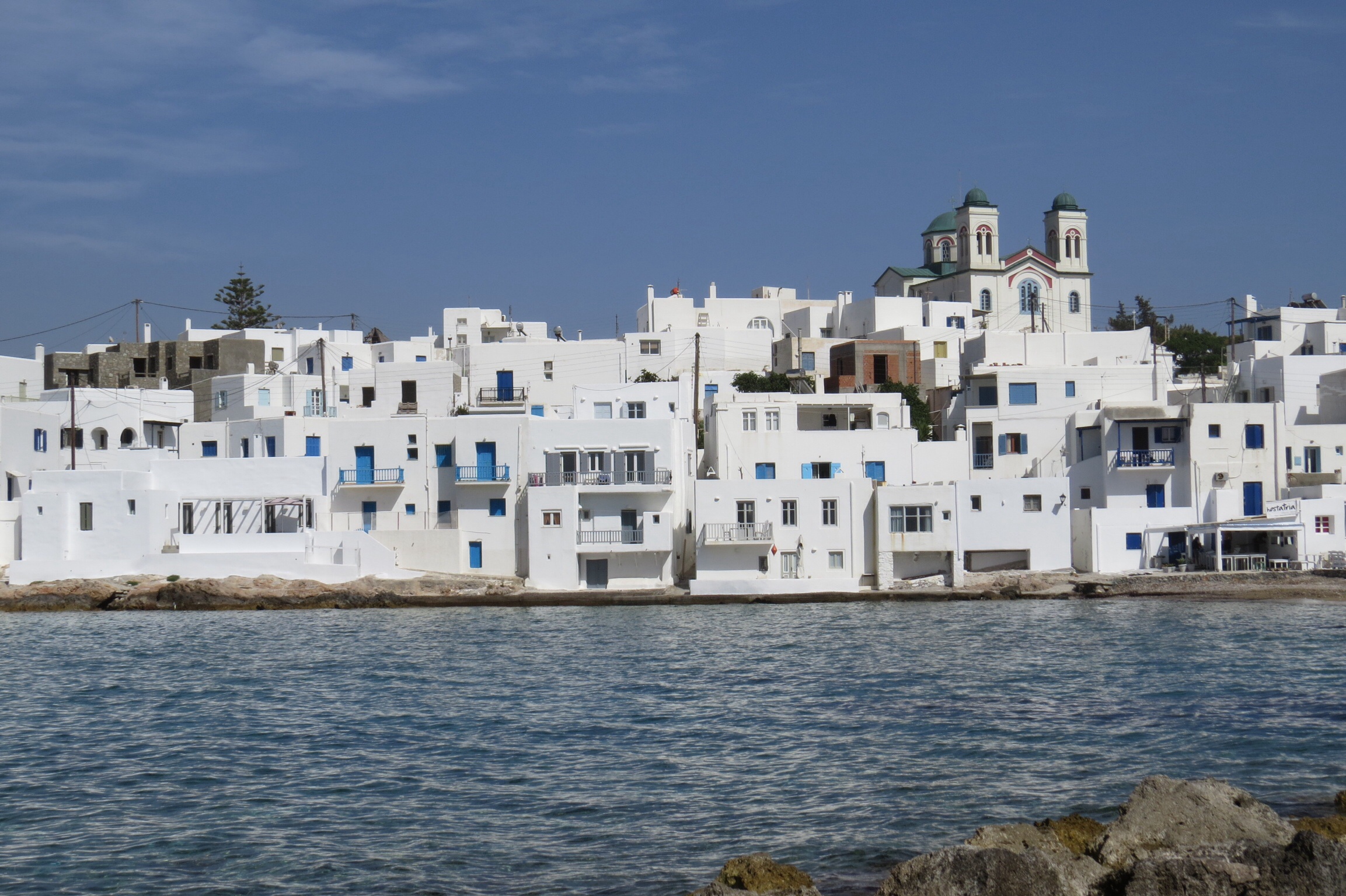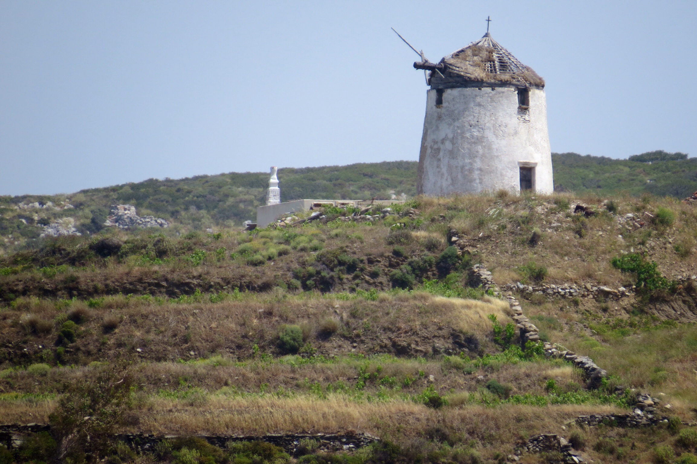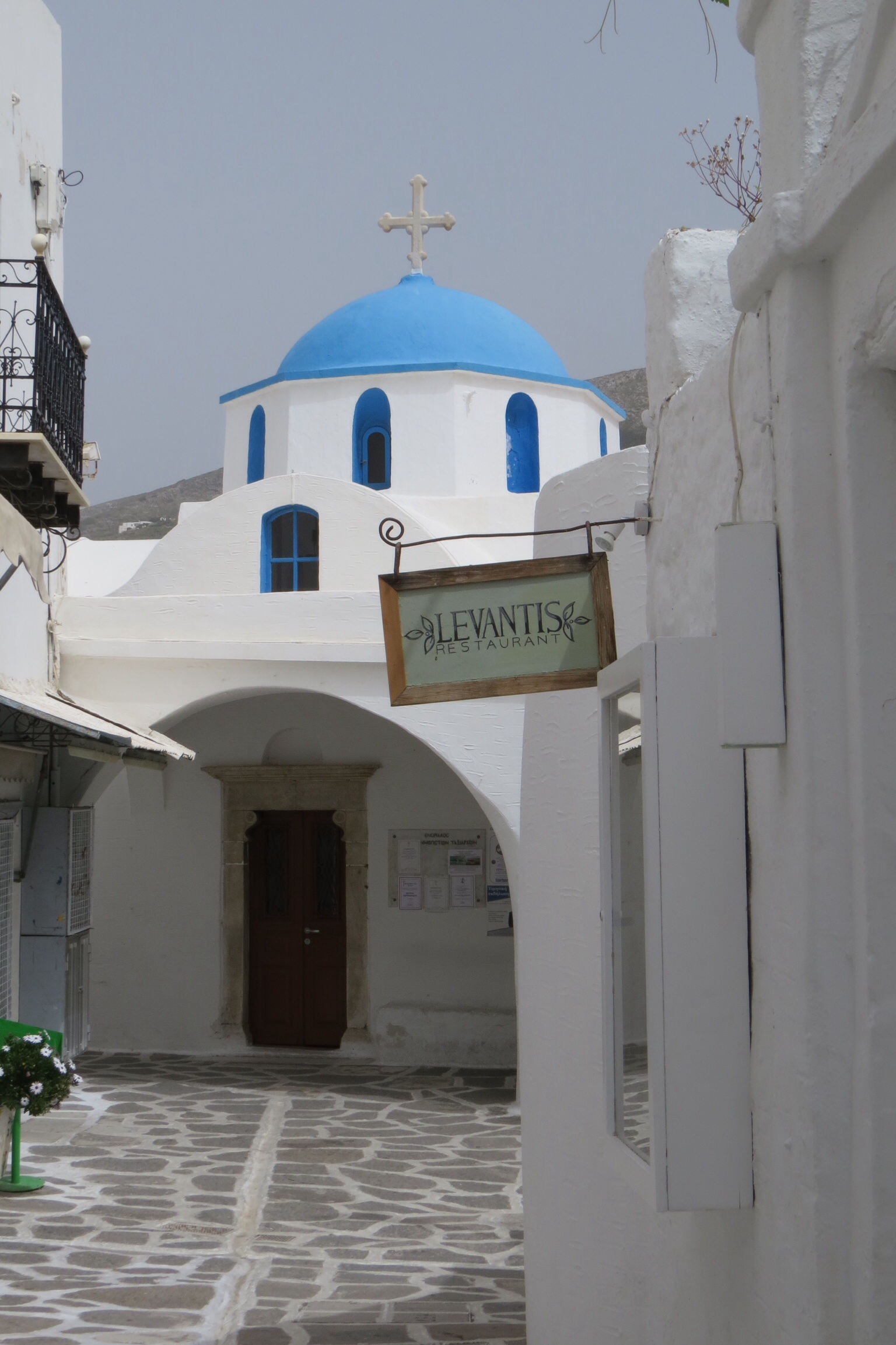 The island is dotted with windmills and the familiar blue domes of countless churches and family chapels on the Cycladic islands.