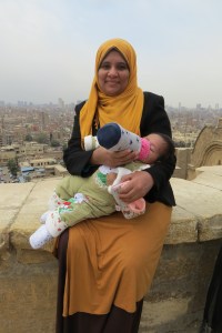 A lovely woman outside the Mosque was happy to be photographed in a quiet moment with her baby against the Cairo backdrop.