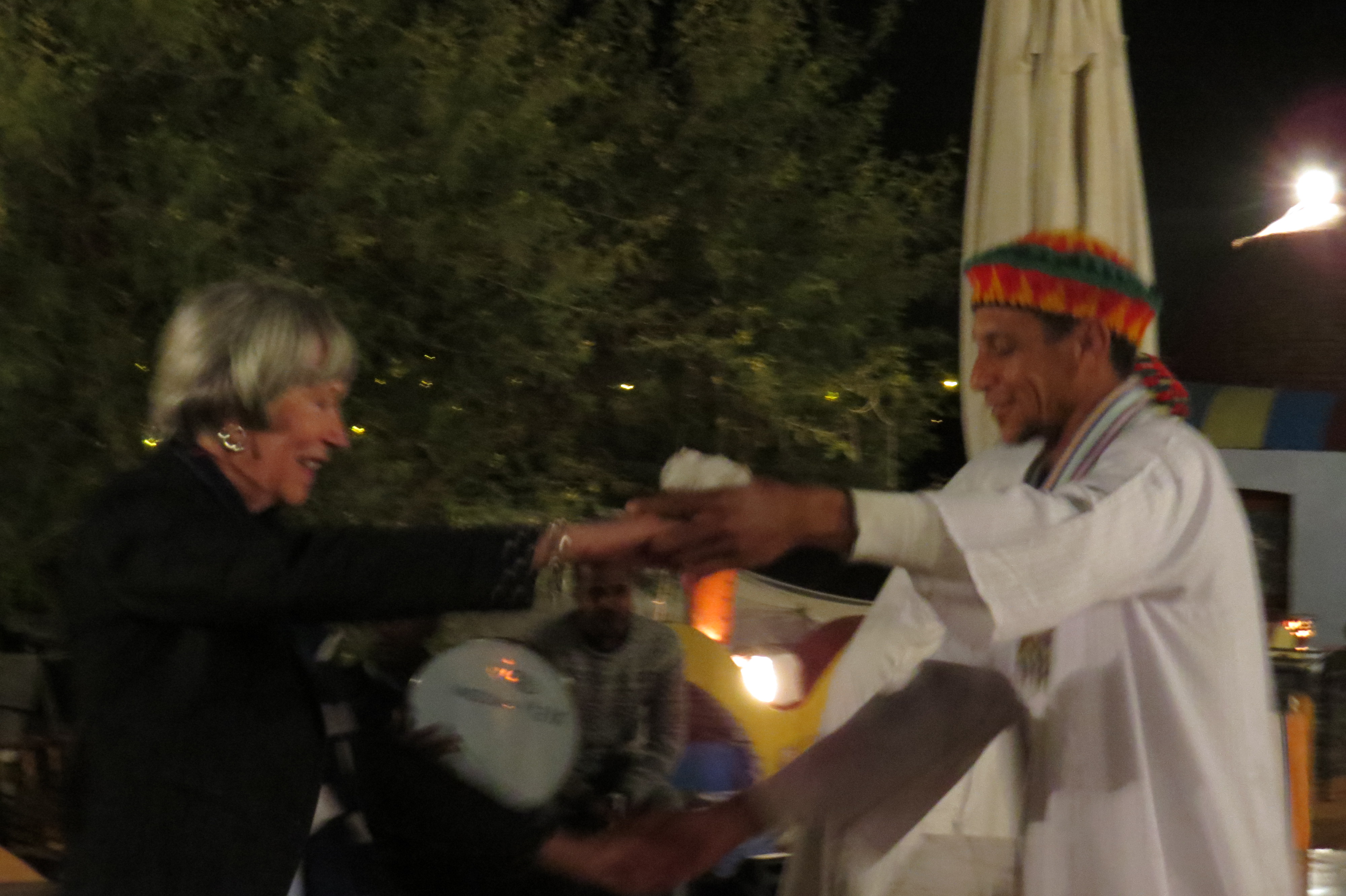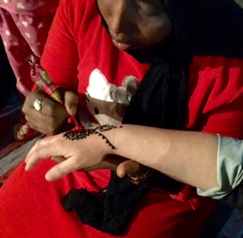 Nubian women wear beautiful patterns on their hands, like black versions of the brown hennas that celebrate women’s hands in India. Of course several of us jumped in offering our hands.. Each one was done in a few minutes, each one different. Our awesome men waited patiently, sipping Karkady tea..