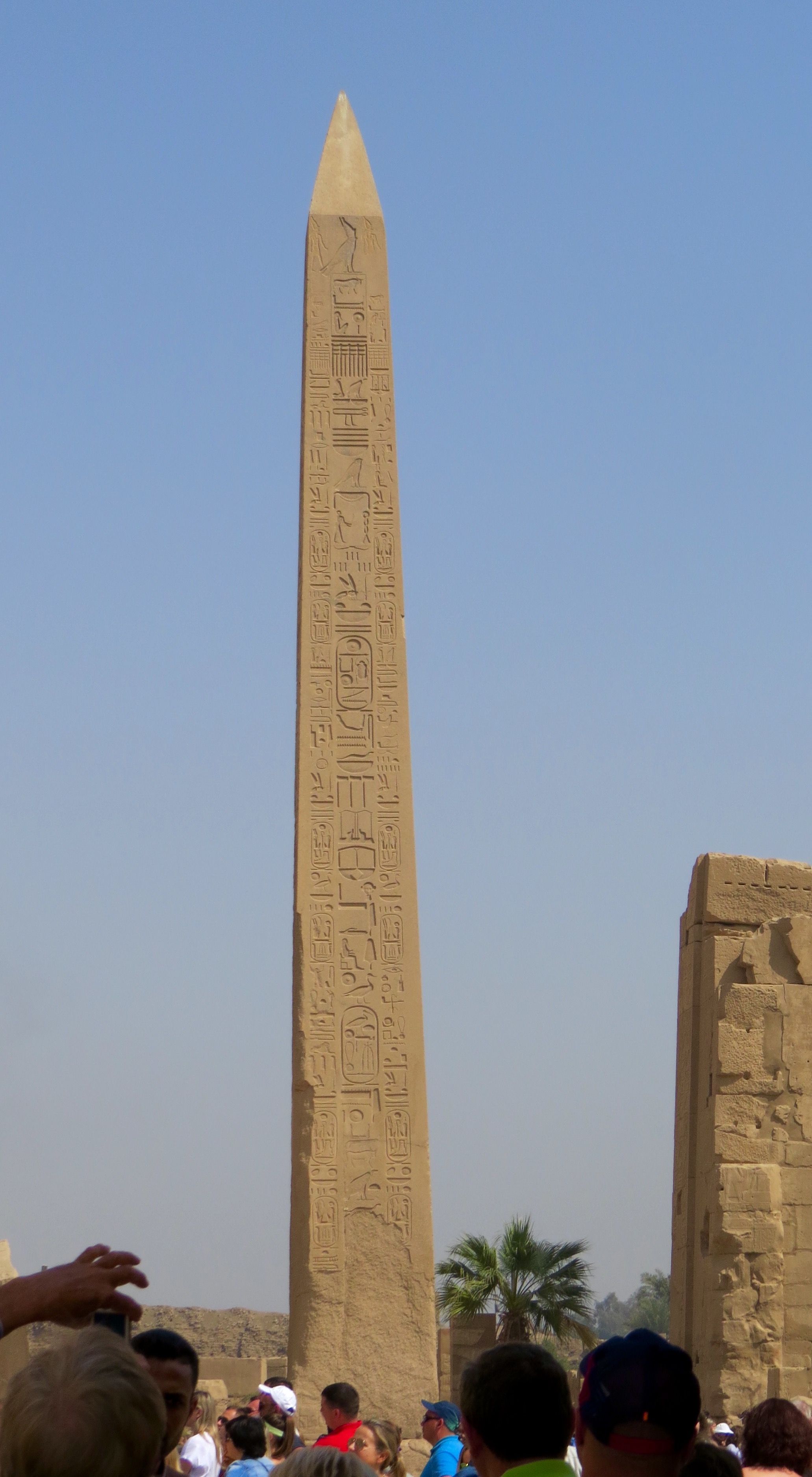 Hatshepsut had twin obelisks, at the time the tallest in the world, erected at the entrance to the temple. One still stands, as the tallest surviving ancient obelisk on Earth; the other has broken in two and toppled. She later ordered the construction of two more obelisks to celebrate her sixteenth year as pharaoh; one of the obelisks broke during construction, and thus, a third was constructed to replace it. The broken obelisk was left at its quarrying site which we saw in Aswan, where it remains.
