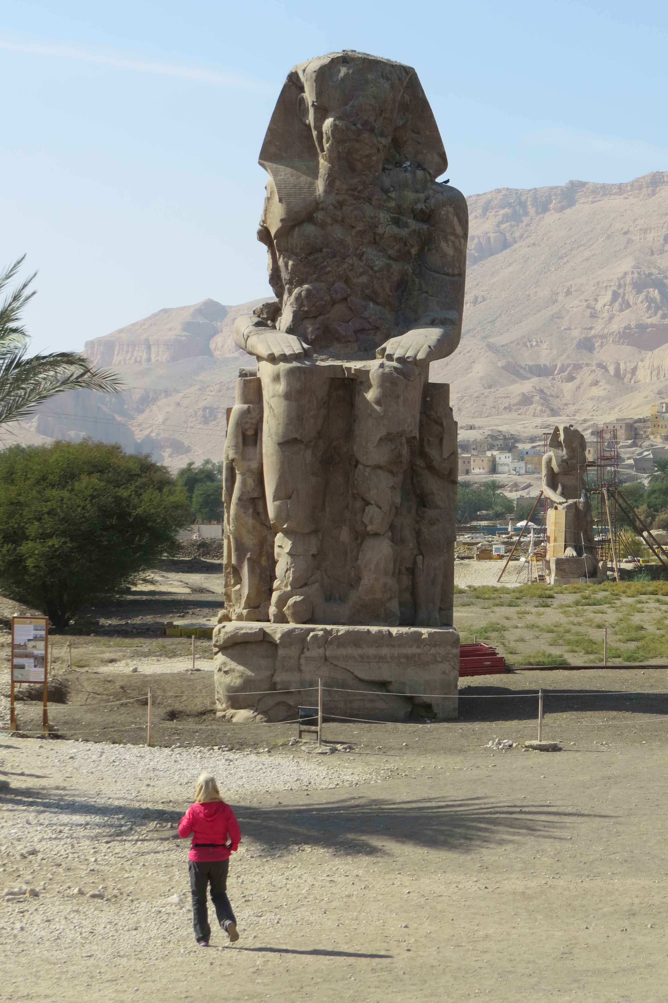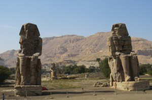 Shortly after leaving Hapshetsut’s magnificent temple, we stopped to see the Colossi of Memnon. More Ramses II colossi? No! These depict Amenhotep III who reigned from 1389 – 1351 BCE. 60 feet tall, these are believed to have guarded Amenhotep’s mortuary, a temple which was even larger than Karnak in its day. Other statues are being discovered on the site; one can be seen in the background of the second image. The statues were damaged in an ancient eathquake and since ancient times the statues reportedly burst into “song” from time to time. Considered good luck, we hoped to hear the sound, but it was not to be today. We felt pretty lucky anyway.