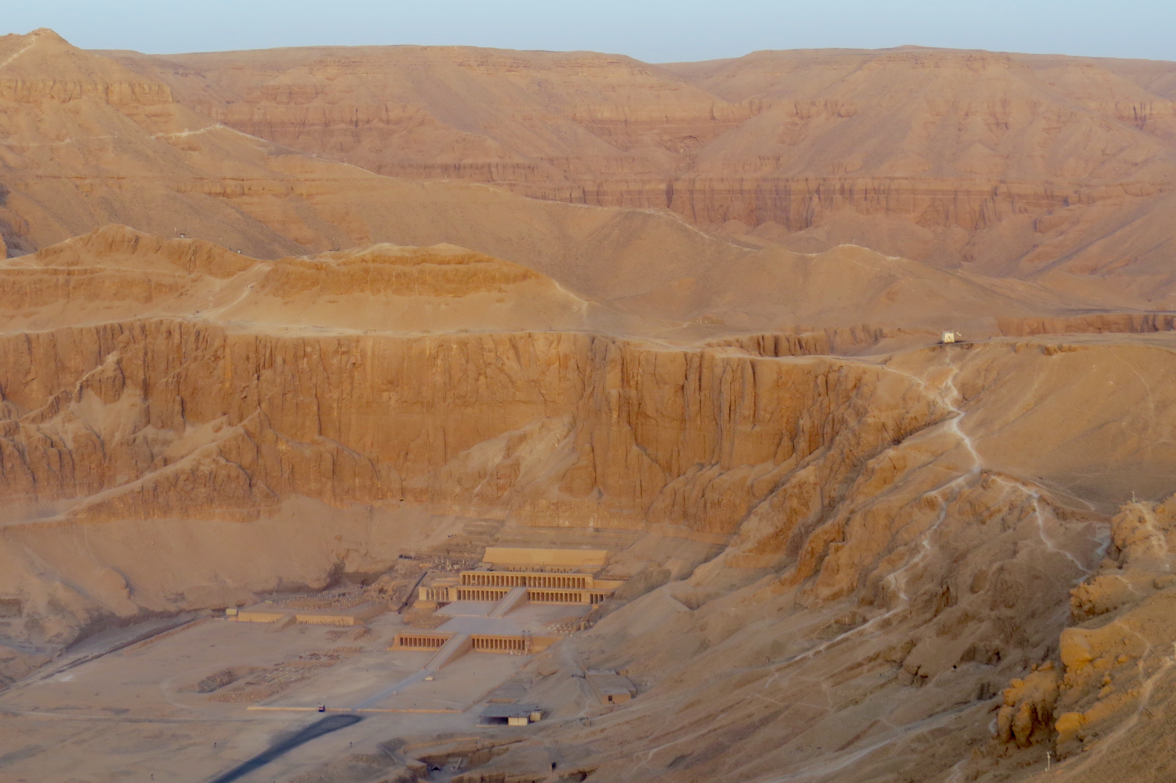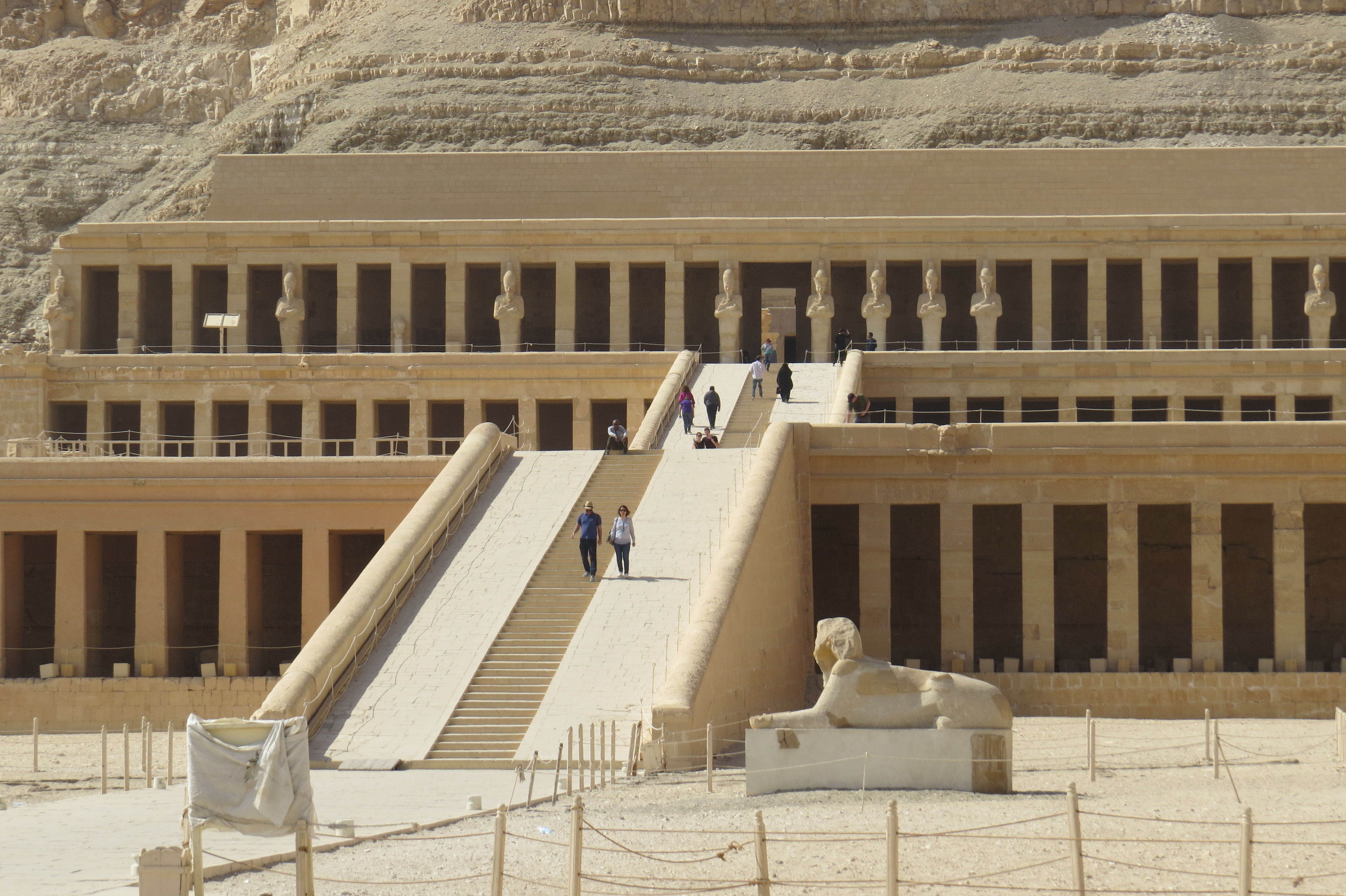 Hatshepsut’s greatest efforts went into building projects which not only elevated her name and honored the gods but employed the people. The scope and size of Hatshepsut’s constructions, as well as their elegant beauty, attest to a very prosperous reign. We had already seen her magnificent constructions and obelisks at Karnak. Following the tradition of many pharaohs, the masterpiece of Hatshepsut’s building projects was a mortuary temple. She built hers here at Deir el-Bahri. The focal point was the Djeser-Djeseru or “the Sublime of Sublimes”, a colonnaded structure of perfect harmony built nearly one thousand years before the Parthenon. Djeser-Djeseru and the other buildings of Hatshepsut’s Deir el-Bahri complex are considered to be significant advances in architecture.