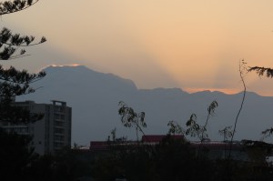 We wandered the city to get oriented and later, went to a nearby restaurant for our first group dinner, which began with the country’s national drink, a Pisco Sour, followed by a delicious meal. Next morning, a view from my hotel room which overlooks Parque Forestal with the Andes in the distance: