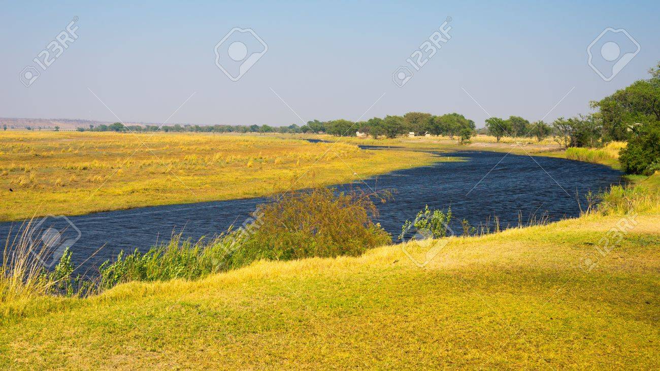 Chobe River landscape, view from Caprivi Strip on Namibia Botswana border, Africa. Chobe National Park, famous wildlilfe reserve and upscale travel destination.